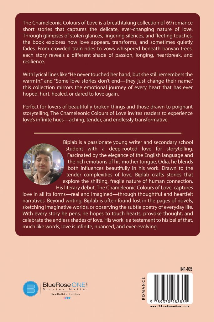 The Chameleonic Colours of Love is a collection of 69 romance short stories — each one a tiny echo of love in its many shades. From unspoken confessions on a train to fading memories under banyan trees, this book is a tapestry of tender moments, aching silences, and emotional truths.